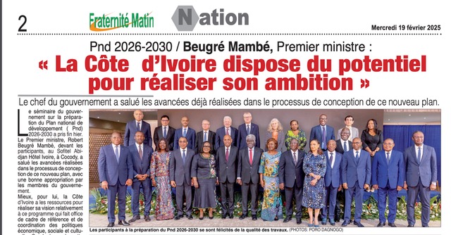 The head of government welcomed the progress already made in the design process for this new plan. The seminar on the PND 2026–2030, themed “Côte d’Ivoire’s Trajectory Toward Upper-Middle Income Status by 2030,” brought together a wide range of national and international experts, government officials, minister-governors, and private sector stakeholders. It took place in Abidjan from February 17 to 18, 2025.